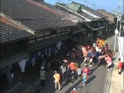 午前7時(予定)、獅子舞(大)と獅子舞(小)がほぼ同じ場所から、しかし別の方向へ町廻りに出発しました。左の画像は、獅子舞(小)が町廻りを開始した頃の様子です。画像の右端に卯建(うだつ、地元では「ソデ」とも呼ぶそう)が見える建物は、明治27年建築と伝わる松田家です。(次の下の画像が同家の軒部分)参考[0808-02.49]